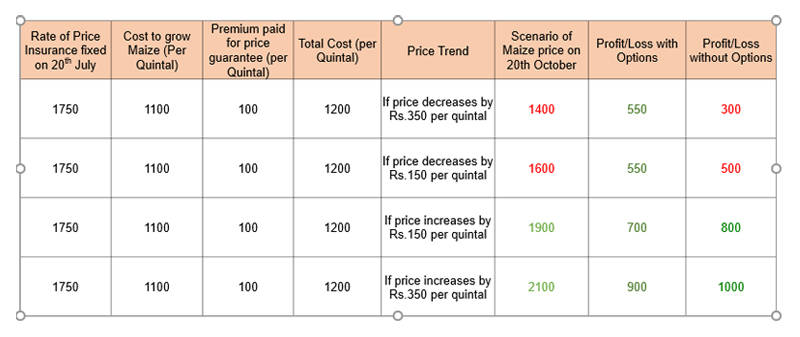 Let us say that a farmer / FPO buys an option. An option gives the farmer / FPO right to sell at a particular price on a particular day. If a farmer buys an option on 20-Jul-20 – A Put option of Maize, strike price 1750 Oct-20 Expiry. Now he has a right to sell Maize at Rs.1750/ Quintal on November 20. For Maize, let’s say there is a reduction of price from 1750 to 1400 on Nov 20, he can still sell it in 1750, as farmer has bought the option. This would give him an extra 350/ quintal compared to then market price. If there is an increase in the price from 1750 to say, 1900, he can still sell it at a market price of 1900, as buying an option is not an obligation to sell, but a right to sell. The only loss to a farmer, in this case, is the premium he paid to buy the option.