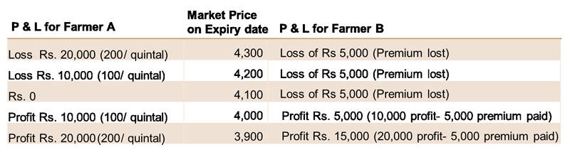 In below table Farmer A sells futures contract at Rs.4100/quintal and Farmer B buys Put option for strike price Rs.4100/quintal